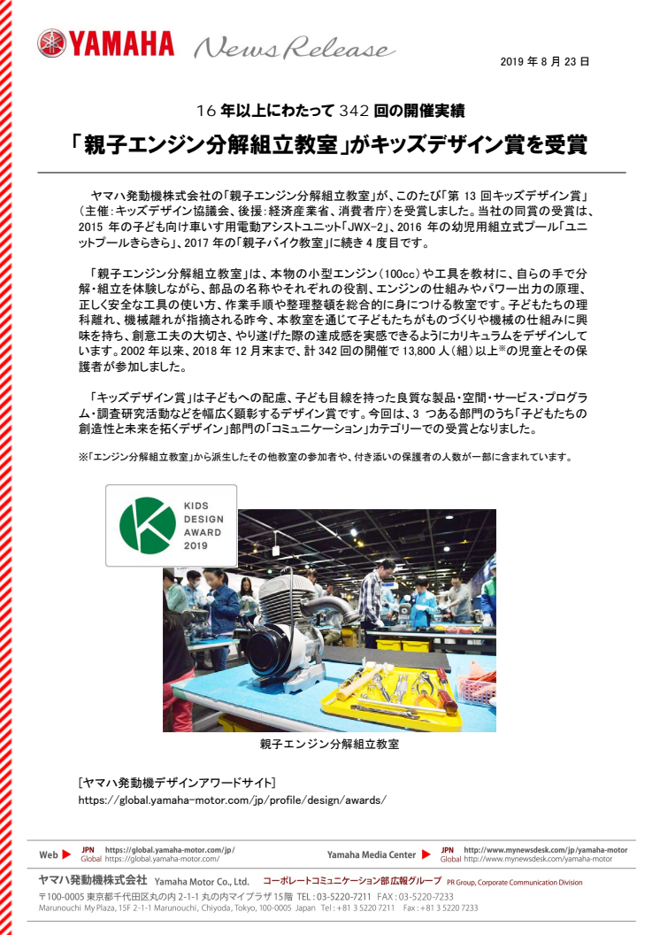 ヤマハ発動機株式会社の「親子エンジン分解組立教室」が、このたび「第13回キッズデザイン賞」(主催:キッズデザイン協議会、後援:経済産業省、消費者庁)を受賞しました。当社の同賞の受賞は、2015年の子ども向け車いす用電動アシストユニット「JWX-2」、2016年の幼児用組立式プール「ユニットプールきらきら」、2017年の「親子バイク教室」に続き4度目です。