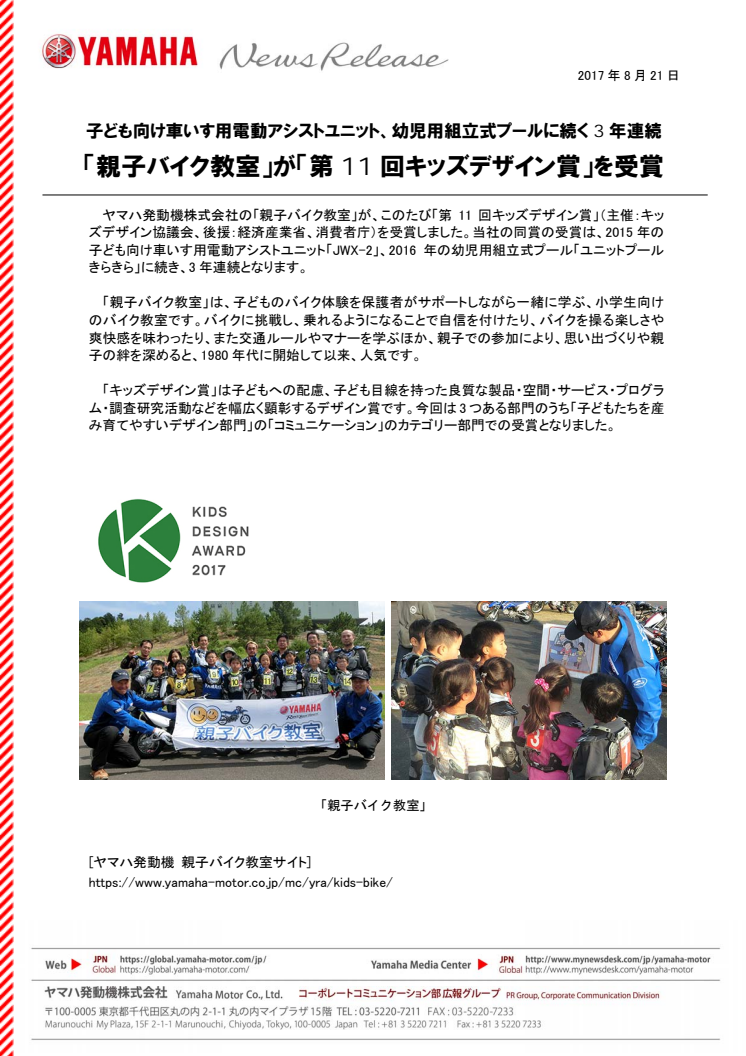 ヤマハ発動機株式会社の「親子バイク教室」が、このたび「第11回キッズデザイン賞」(主催:キッズデザイン協議会、後援:経済産業省、消費者庁)を受賞しました。当社の同賞の受賞は、2015年の子ども向け車いす用電動アシストユニット「JWX-2」、2016年の幼児用組立式プール「ユニットプールきらきら」に続き、3年連続となります。
