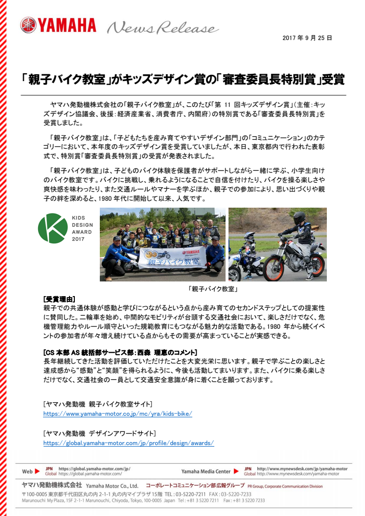 ヤマハ発動機株式会社の「親子バイク教室」が、このたび「第11回キッズデザイン賞」(主催:キッズデザイン協議会、後援:経済産業省、消費者庁、内閣府)の特別賞である「審査委員長特別賞」を受賞しました。