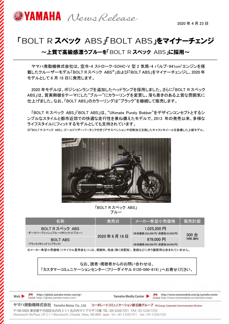 ヤマハ発動機株式会社は、空冷・4ストローク・SOHC・V型2気筒・4バルブ・941cm3エンジンを搭載したクルーザーモデル「BOLT Rスペック ABS※」および「BOLT ABS」をマイナーチェンジし、2020年モデルとして6月18日に発売します。