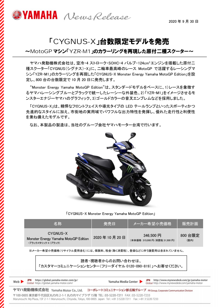 「CYGNUS-X」台数限定モデルを発売 〜MotoGPマシン「YZR-M1」のカラーリングを再現した原付二種スクーター〜