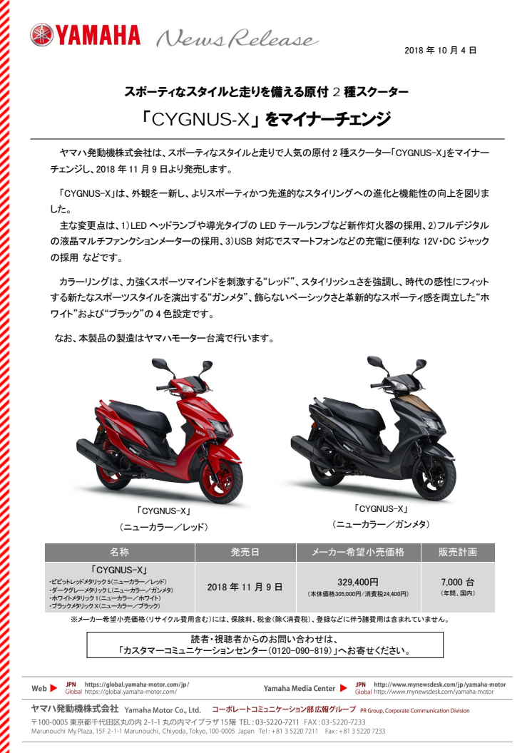 ヤマハ発動機株式会社は、スポーティなスタイルと走りで人気の原付2種スクーター「CYGNUS-X」をマイナーチェンジし、2018年11月9日より発売します。