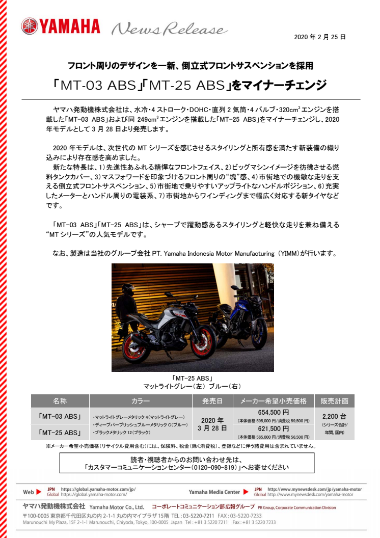 ヤマハ発動機株式会社は、水冷・4ストローク・DOHC・直列2気筒・4バルブ・320cm3エンジンを搭載した「MT-03 ABS」および同249cm3エンジンを搭載した「MT-25 ABS」をマイナーチェンジし、2020年モデルとして3月28日より発売します。