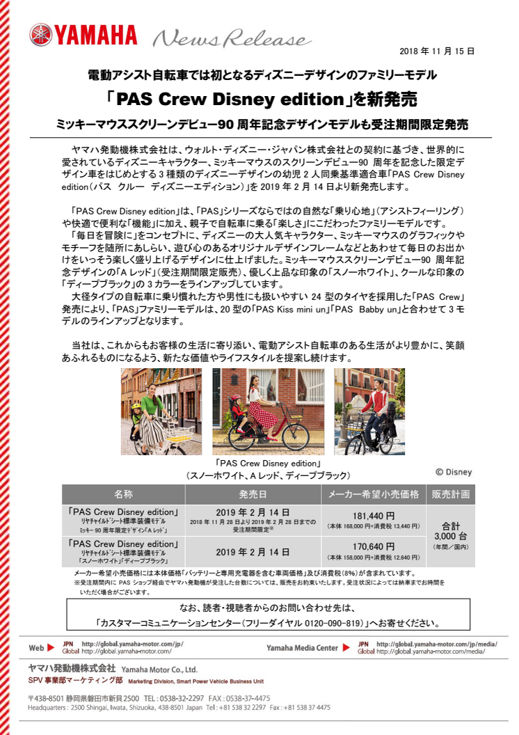 ヤマハ発動機株式会社は、ウォルト・ディズニー・ジャパン株式会社との契約に基づき、世界的に愛されているディズニーキャラクター、ミッキーマウスのスクリーンデビュー90周年を記念した限定デザイン車をはじめとする3種類のディズニーデザインの幼児2人同乗基準適合車「PAS Crew Disney edition(パス クルー ディズニーエディション)」を2019年2月14日より新発売します。