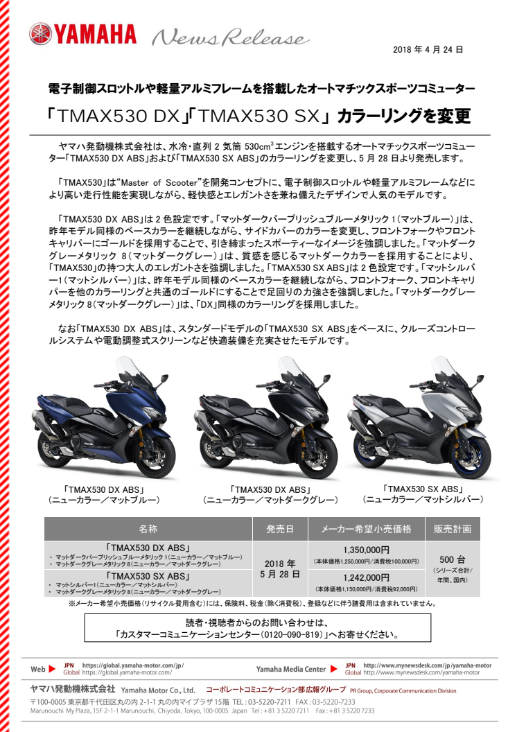 ヤマハ発動機株式会社は、水冷・直列2気筒530cm 3エンジンを搭載するオートマチックスポーツコミューター「TMAX530 DX ABS」および「TMAX530 SX ABS」のカラーリングを変更し、5月28日より発売します。