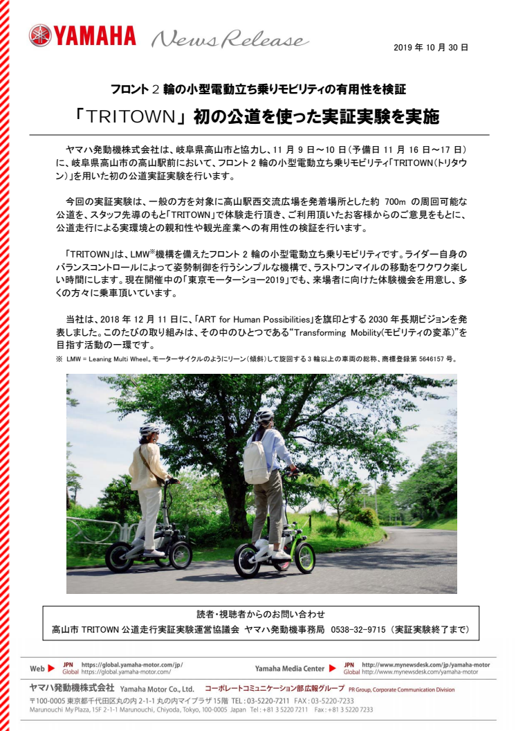 ヤマハ発動機株式会社は、岐阜県高山市と協力し、11月9日〜10日(予備日11月16日〜17日)に、岐阜県高山市の高山駅前において、フロント2輪の小型電動立ち乗りモビリティ「TRITOWN(トリタウン)」を用いた初の公道実証実験を行います。