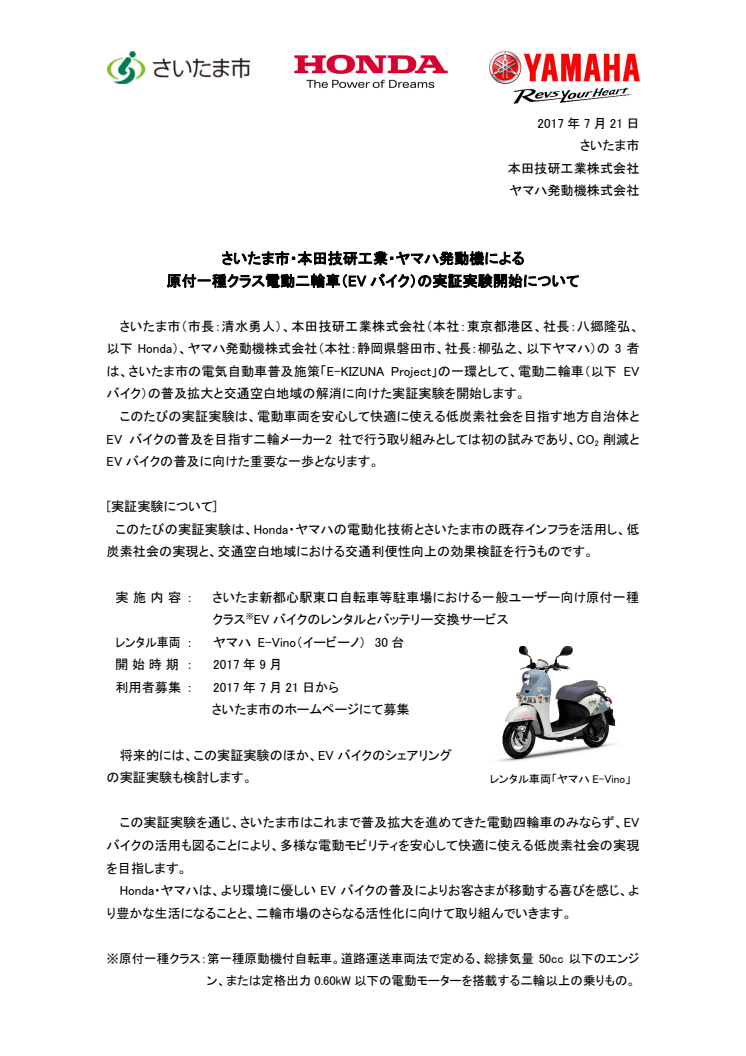 さいたま市・本田技研工業・ヤマハ発動機による原付一種クラス電動二輪車(EVバイク)の実証実験開始について