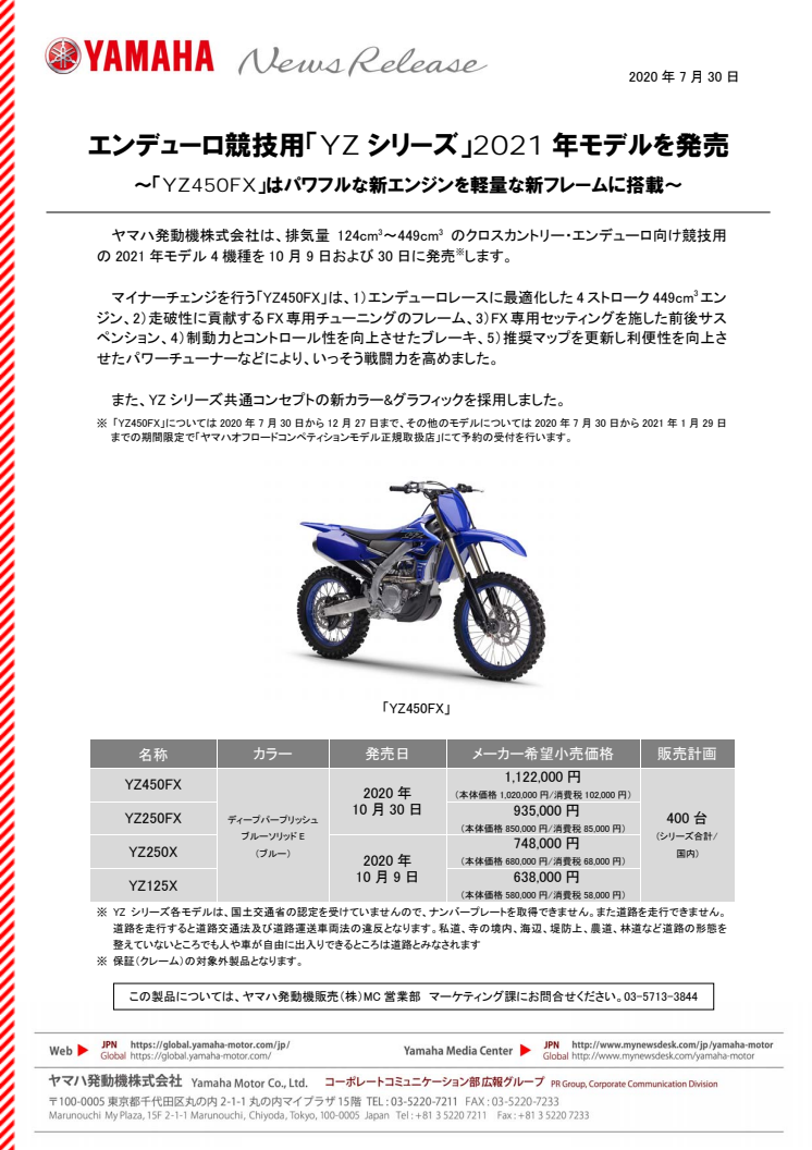 ※ 「YZ450FX」については2020年7月30日から12月27日まで、その他のモデルについては2020年7月30日から2021年1月29日までの期間限定で「ヤマハオフロードコンペティションモデル正規取扱店」にて予約の受付を行います。
