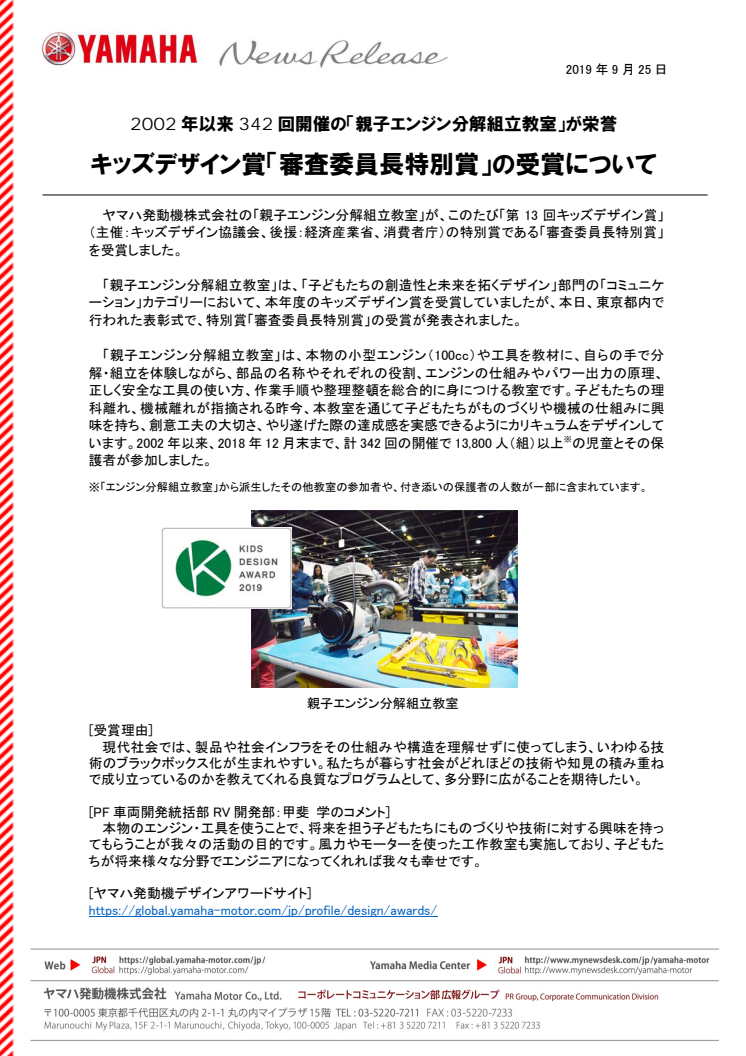 ヤマハ発動機株式会社の「親子エンジン分解組立教室」が、このたび「第13回キッズデザイン賞」(主催:キッズデザイン協議会、後援:経済産業省、消費者庁)の特別賞である「審査委員長特別賞」を受賞しました。