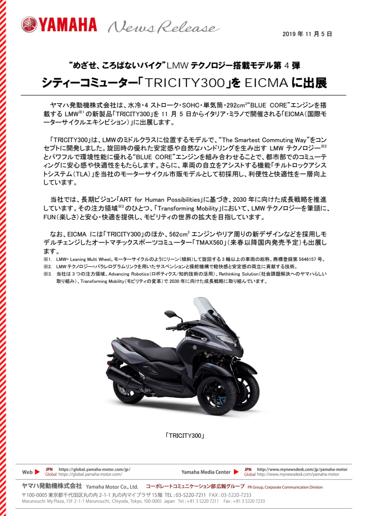 ヤマハ発動機株式会社は、水冷・4ストローク・SOHC・単気筒・292cm3“BLUE CORE”エンジンを搭載するLMW※1の新製品「TRICITY300」を11月5日からイタリア・ミラノで開催される「EICMA(国際モーターサイクルエキシビション)」に出展します。