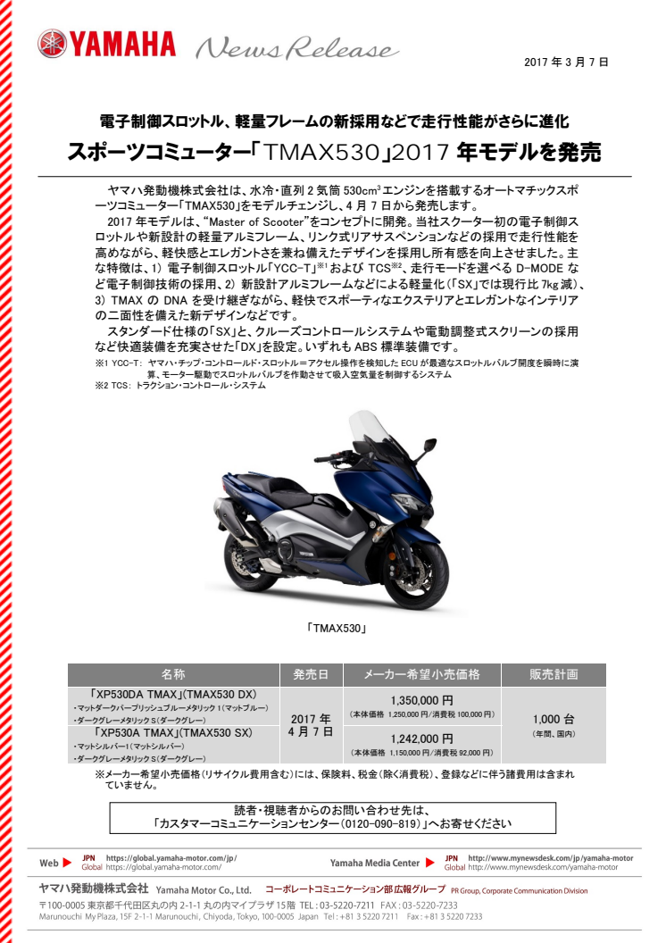 ヤマハ発動機株式会社は、水冷・直列2気筒530cm3エンジンを搭載するオートマチックスポーツコミューター「TMAX530」をモデルチェンジし、4月7日から発売します。