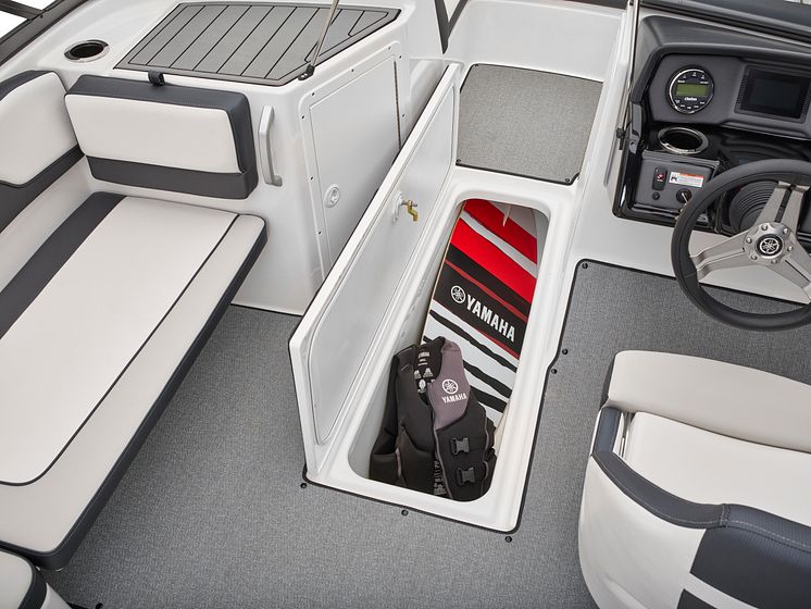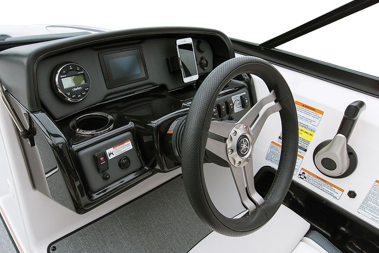 2019年モデルでは、コンパクトな艇体ながらパワフルな推進力があり、多彩なマリンスポーツに対応する「AR195」をフルモデルチェンジしました。全長、全幅のスケールアップにより船内のスペースを拡大させたことで広々とした快適な空間を提供するほか、新設計の船底形状を採用することで加速感やハンドリング性能の向上など走行性能をさらに高めました。装備の面では運転情報、各種操船コントロールを集中管理できる「ConnextⓇ(コネクスト)」を採用し、タッチセンサー付きの4.3インチカラー液晶マルチファンクションディスプレイを搭載したほか、可動式スマートフォンホルダーの設置、燃料タンクの容量アップ、ストレージ形状を変更するなど、細部において利便性と機能性を高めました。