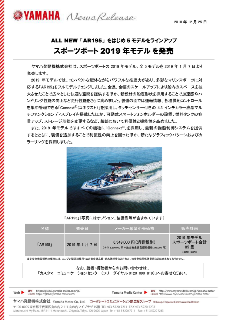 ヤマハ発動機株式会社は、スポーツボートの2019年モデル、全5モデルを2019年1月7日より発売します。