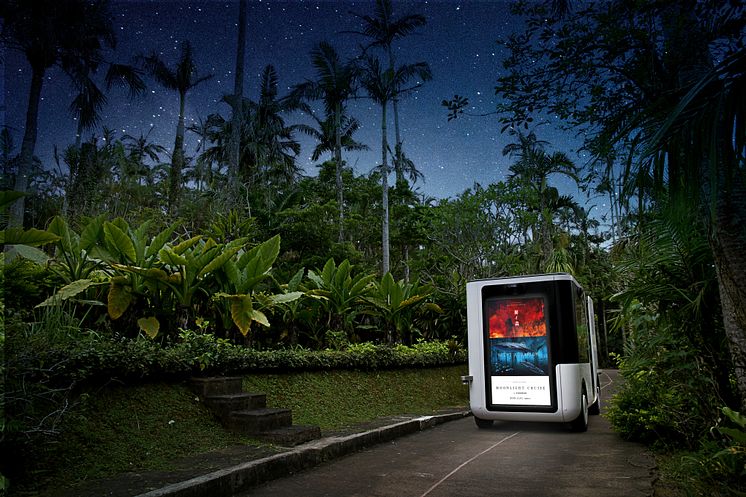今回、実施するサービス「ムーンライトクルーズ」は、日没後に SC-1に乗車して体験いただくものです。自動運転機能により乗員は車両をコントロールすることなく、超高感度なイメージセンサーと高解像度ディスプレイが映し出す夜間の走行シーンをベースに、融合現実感技術が創り出すエンタテインメントコンテンツを楽しめます。