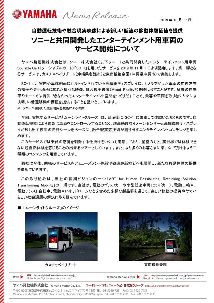 ヤマハ発動機株式会社は、ソニー株式会社(以下ソニー)と共同開発したエンターテインメント用車両Sociable Cart(ソーシャブルカート)「SC-1」を用いたサービスを2019年11月1日より開始します。第一弾となるサービスは、カヌチャベイリゾート(沖縄県名護市)と東南植物楽園(沖縄県沖縄市)で実施します。