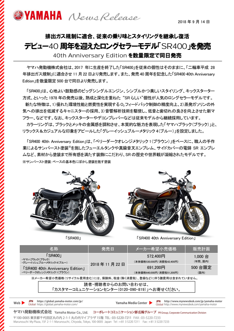デビュー40周年を迎えたロングセラーモデル「SR400」を発売 排出ガス規制に適合、従来の乗り味とスタイリングを継承し復活 40th Anniversary Editionを数量限定で同日発売