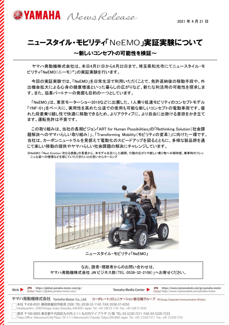 ヤマハ発動機株式会社は、本日4月21日から6月22日まで、埼玉県和光市にてニュースタイル・モビリティ「NeEMO(ニーモ)※」の実証実験を行います。