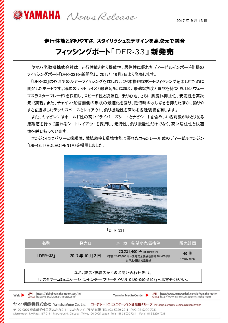 ヤマハ発動機株式会社は、走行性能と釣り機能性、居住性に優れたディーゼルインボード仕様のフィッシングボート「DFR-33」を新開発し、2017年10月2日より発売します。