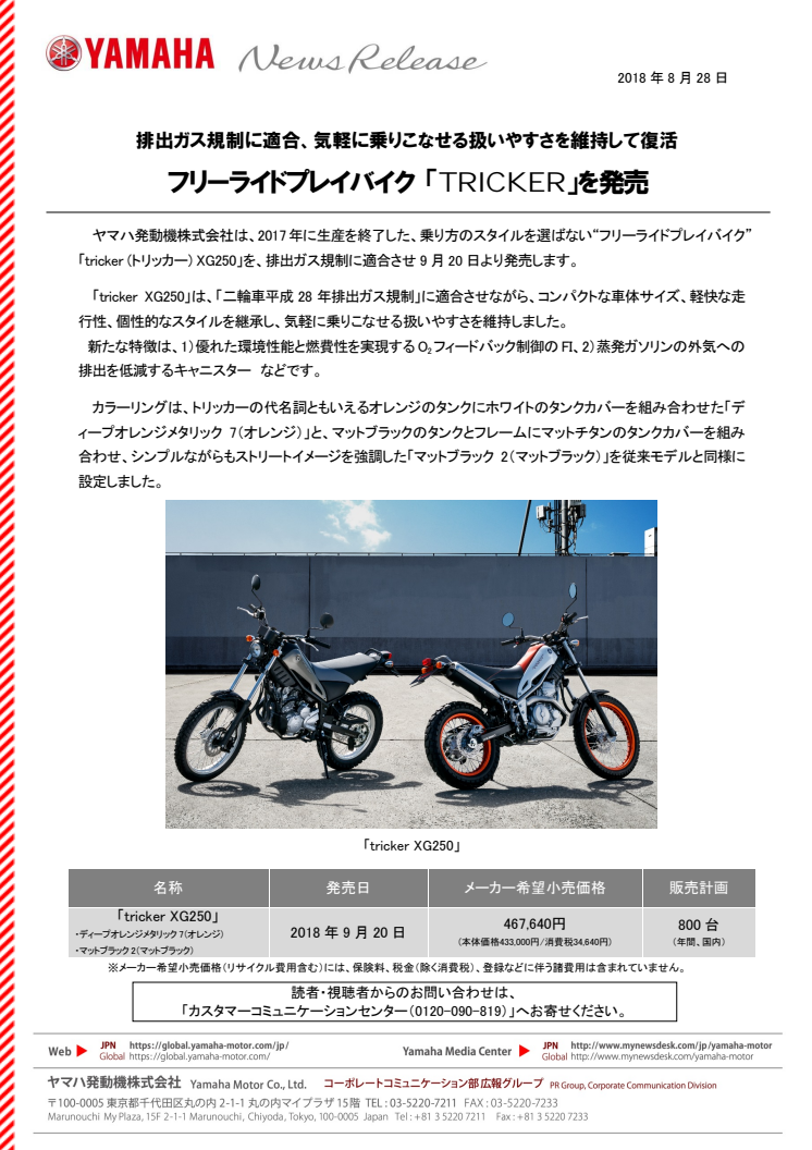 ヤマハ発動機株式会社は、2017年に生産を終了した、乗り方のスタイルを選ばない“フリーライドプレイバイク”「tricker (トリッカー) XG250」を、排出ガス規制に適合させ9月20日より発売します。