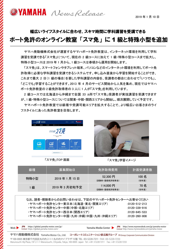 ヤマハ発動機株式会社が運営するヤマハボート免許教室は、インターネット環境を利用して学科講習を受講できる「スマ免」について、現在の2級コースに加えて1級・特殊小型コースまで拡大し、特殊小型コースは2019年1月から、1級コースは春頃から運用を開始します。