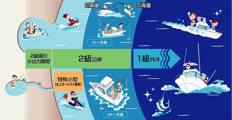 乗り物の大きさや排気量などで区分けする車やバイクの免許の種類と異なり、ボート免許は、基本的には操船場所や陸岸からの距離で区分されます。