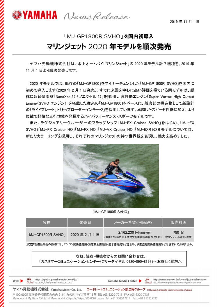 ヤマハ発動機株式会社は、水上オートバイ「マリンジェット」の2020年モデル計7機種を、2019年11月1日より順次発売します。