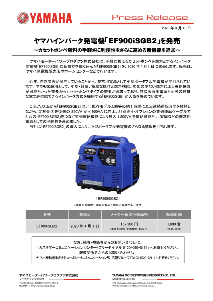 ヤマハモーターパワープロダクツ株式会社は、手軽に扱えるカセットボンベを燃料とするインバータ発電機「EF900iSGB」に新機能を織り込んだ「EF900iSGB2」を、2020年4月1日に発売します。販売は、ヤマハ発電機販売店やホームセンターなどで行います。