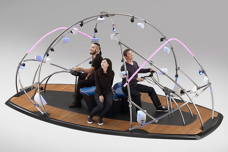 左:音を奏でる電動アシスト車いす「&Y01」、右:乗り物を体感できる音響装置「&Y02」