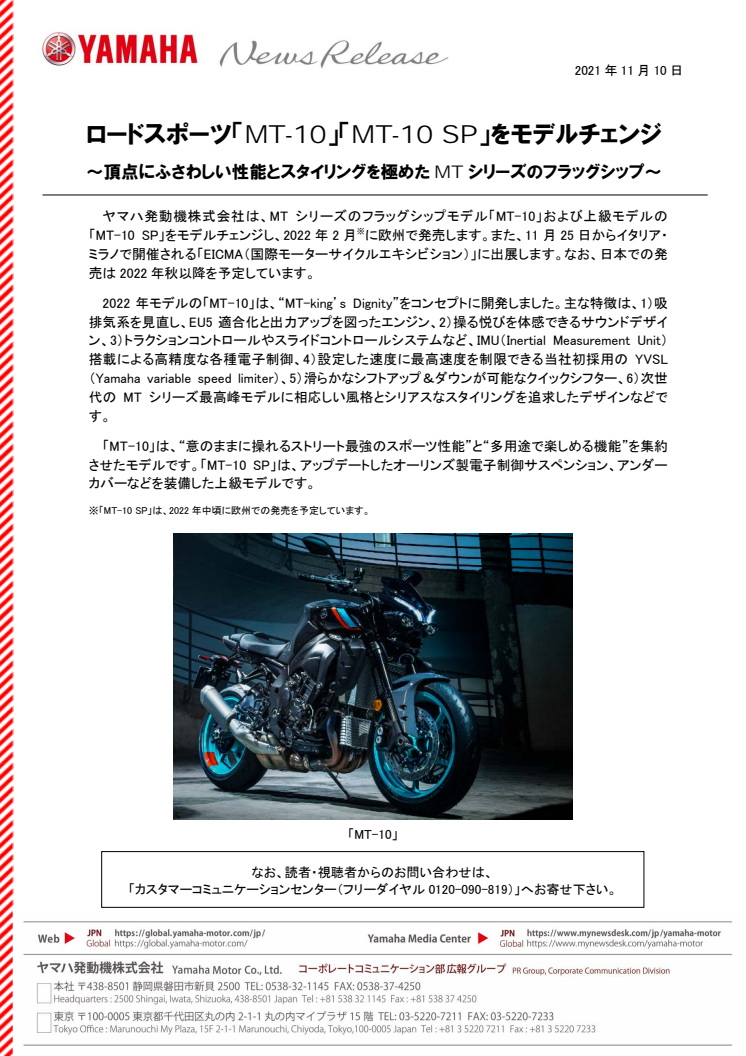 ヤマハ発動機株式会社は、MTシリーズのフラッグシップモデル「MT-10」および上級モデルの「MT-10 SP」をモデルチェンジし、2022年2月※に欧州で発売します。また、11月25日からイタリア・ミラノで開催される「EICMA(国際モーターサイクルエキシビション)」に出展します。なお、日本での発売は2022年秋以降を予定しています。