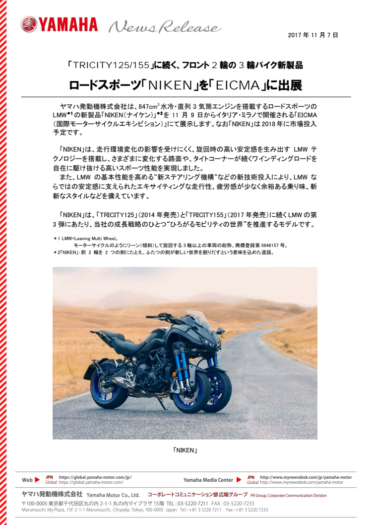 ヤマハ発動機株式会社は、847cm3水冷・直列3気筒エンジンを搭載するロードスポーツのLMW*1の新製品「NIKEN(ナイケン)」*2を11月9日からイタリア・ミラノで開催される「EICMA(国際モーターサイクルエキシビション)」にて展示します。なお「NIKEN」は2018年に市場投入予定です。