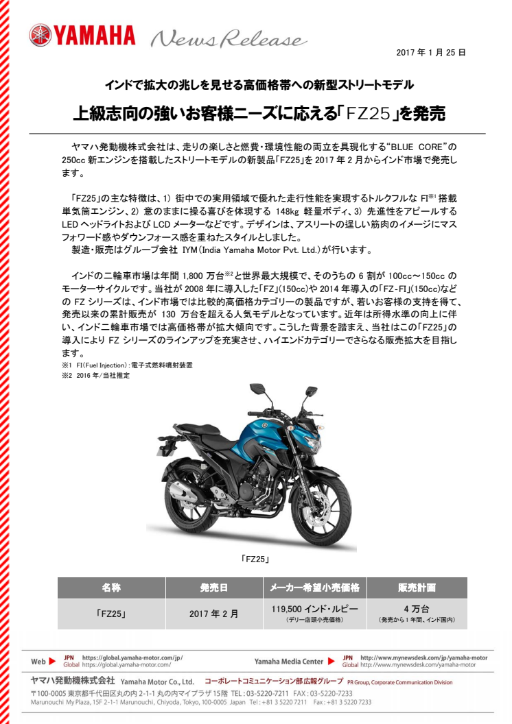 ヤマハ発動機株式会社は、走りの楽しさと燃費・環境性能の両立を具現化する“BLUE CORE”の 250cc新エンジンを搭載したストリートモデルの新製品「FZ25」を2017年2月からインド市場で発売します。
