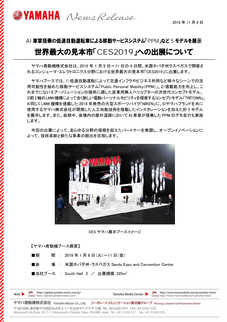 ヤマハ発動機株式会社は、2019年1月8日〜11日の4日間、米国ネバダ州ラスベガスで開催されるコンシューマ・エレクトロニクス分野における世界最大の見本市「CES 2019」に出展します。