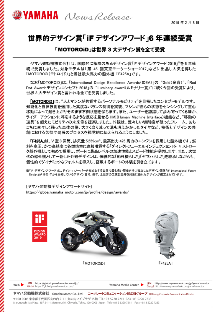 ヤマハ発動機株式会社は、国際的に権威のあるデザイン賞「iFデザインアワード2019」※を6年連続で受賞しました。対象モデルは「第45回東京モーターショー2017」などに出品し人気を博した「MOTOROiD(モトロイド)」と当社最大馬力の船外機 「F425A」です。