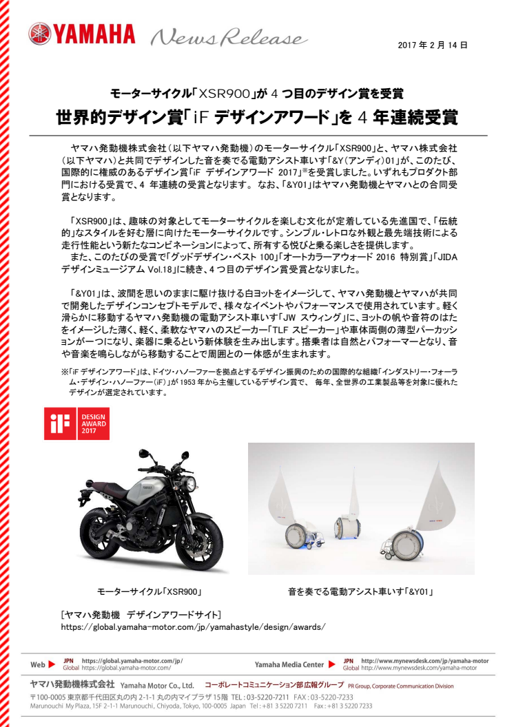ヤマハ発動機株式会社(以下ヤマハ発動機)のモーターサイクル「XSR900」と、ヤマハ株式会社(以下ヤマハ)と共同でデザインした音を奏でる電動アシスト車いす「&Y(アンディ)01」が、このたび、国際的に権威のあるデザイン賞「iFデザインアワード2017」※を受賞しました。いずれもプロダクト部門における受賞で、4年連続の受賞となります。 なお、「&Y01」はヤマハ発動機とヤマハとの合同受賞となります。