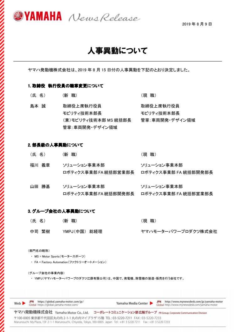 ヤマハ発動機株式会社は、2019年8月15日付の人事異動を下記のとおり決定しました。
