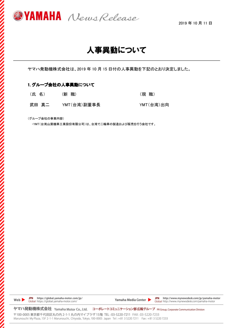 ヤマハ発動機株式会社は、2019年10月15日付の人事異動を下記のとおり決定しました。