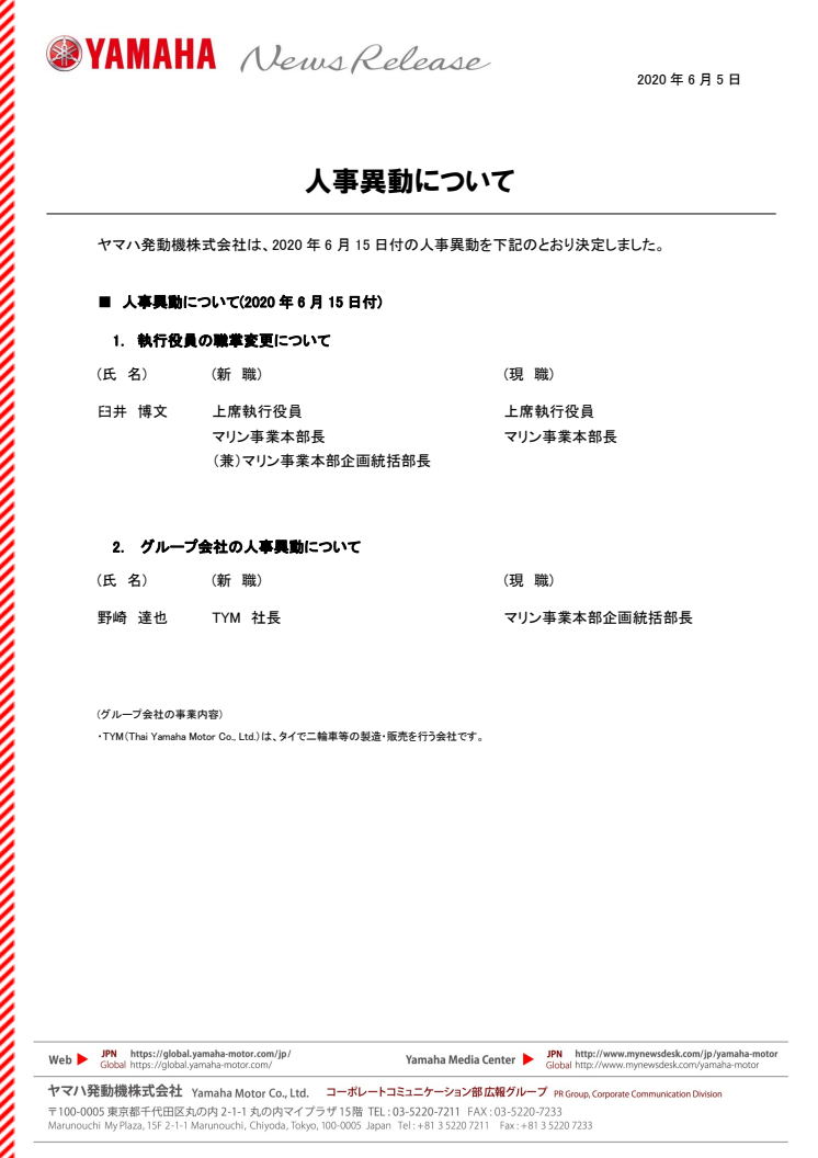 ヤマハ発動機株式会社は、2020年6月15日付の人事異動を下記のとおり決定しました。