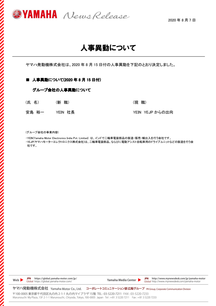ヤマハ発動機株式会社は、2020年8月15日付の人事異動を下記のとおり決定しました。