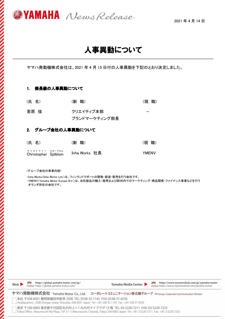 ヤマハ発動機株式会社は、2021年4月15日付の人事異動を下記のとおり決定しました。