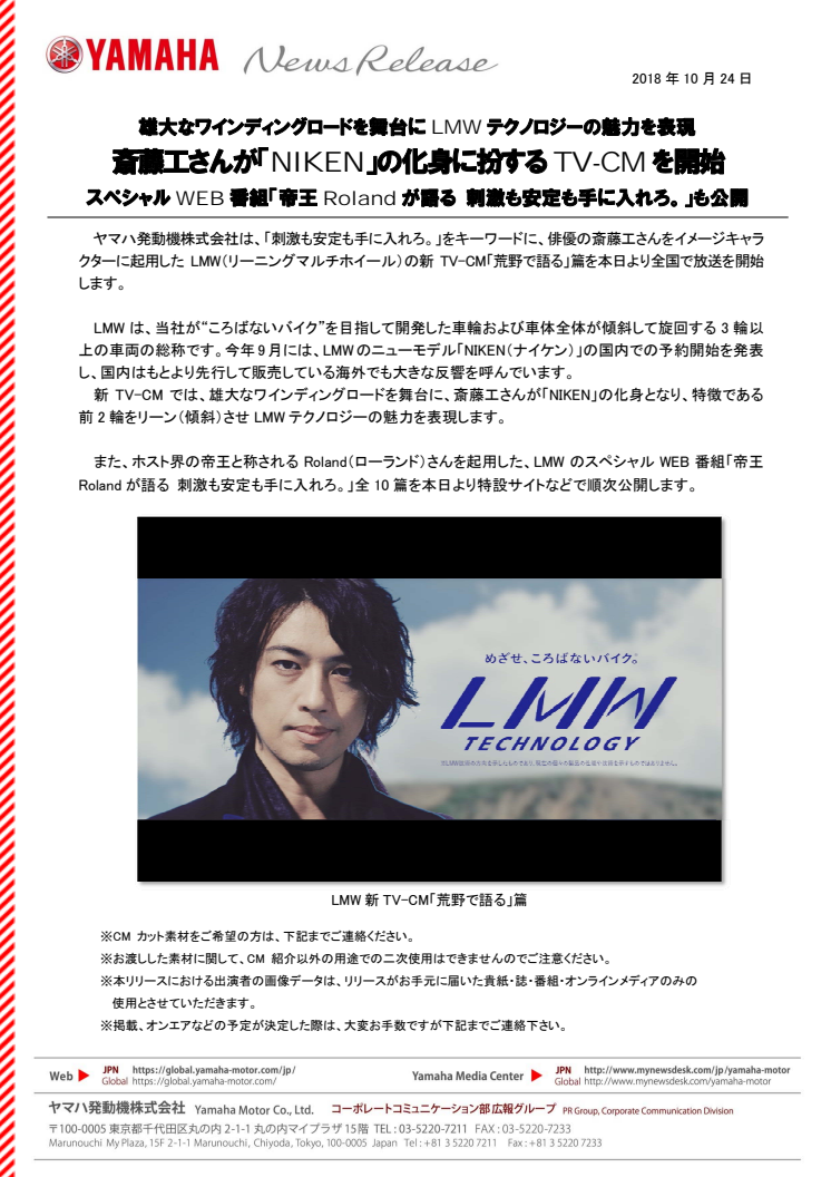 ヤマハ発動機株式会社は、「刺激も安定も手に入れろ。」をキーワードに、俳優の斎藤工さんをイメージキャラクターに起用したLMW(リーニングマルチホイール)の新TV-CM「荒野で語る」篇を本日より全国で放送を開始します。