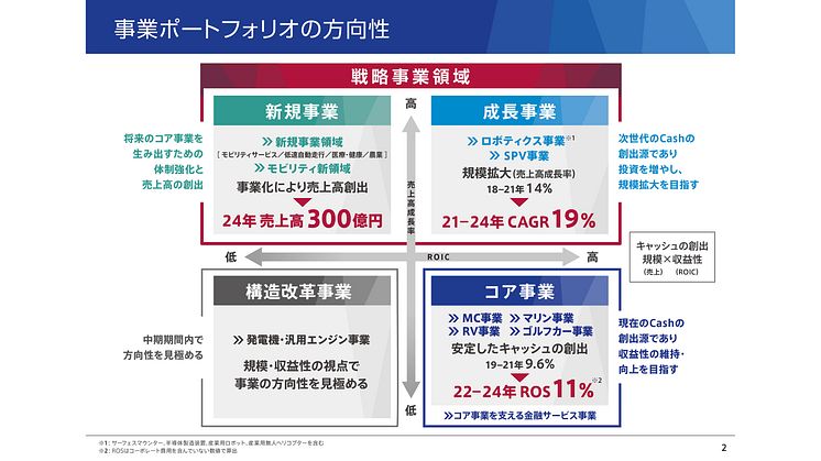新中期経営計画では、売上高成長率と投下資本利益率により事業の位置づけを明確化し、経営資源を適正に配分するポートフォリオマネジメントを進めます。新規事業と成長事業を戦略事業領域として、将来のコア事業に育てるために経営資源を積極的に配分します。