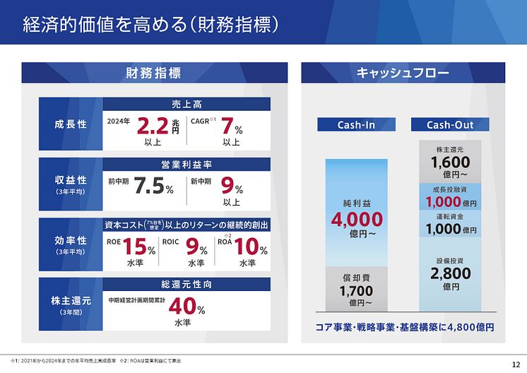 2024年度の売上高2.2兆円以上(年平均売上高成長率7%以上)、3年平均営業利益率9%以上を目指します。