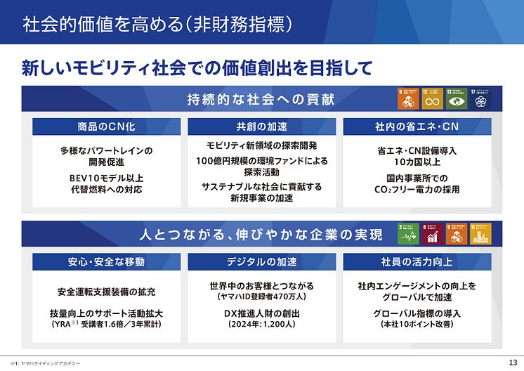 安心・安全な移動の実現に向けては、安全運転支援装備の拡充、技量向上のサポート活動に取り組みます。さらに、生涯を通じたヤマハファンを創造するため、DX戦略を推進し、世界中のお客様とのつながりを広げていきます。そして、人財戦略では、社員エンゲージメントを重要な指標として取り入れ、ダイバーシティ&インクルージョンと人財育成を進めます。