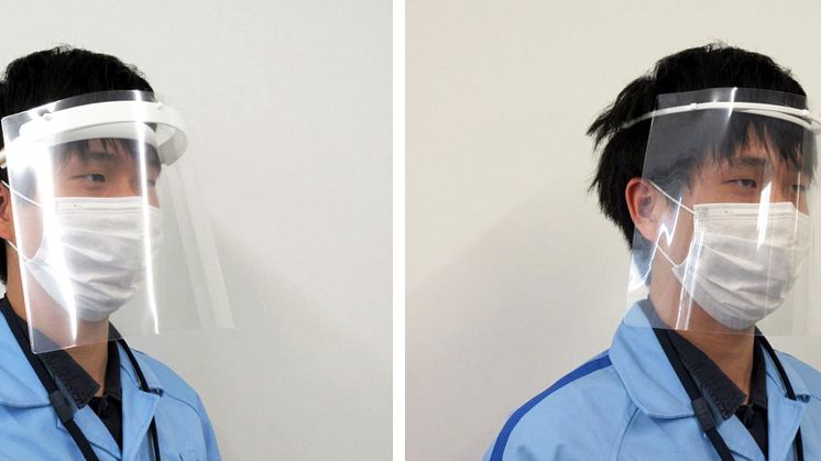 写真左より、フェイスシールド(医師向け)、フェイスシールド(看護師向け)