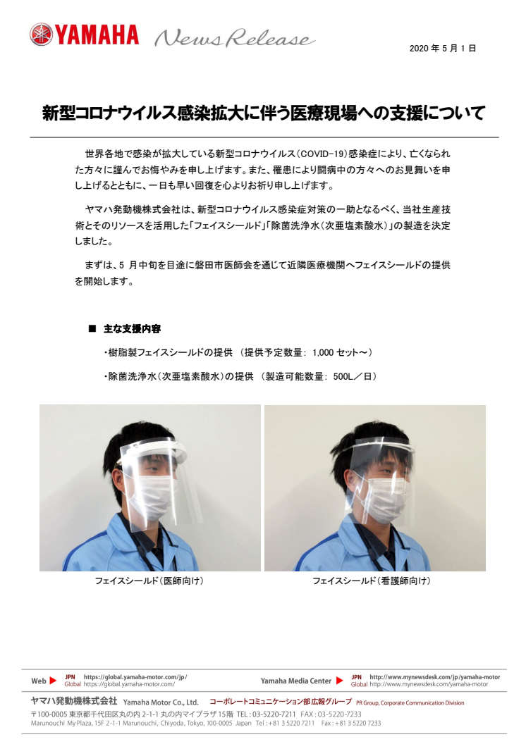 ヤマハ発動機株式会社は、新型コロナウイルス感染症対策の一助となるべく、当社生産技術とそのリソースを活用した「フェイスシールド」「除菌洗浄水(次亜塩素酸水)」の製造を決定しました。