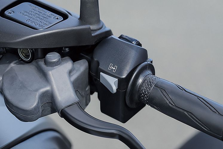 スイッチ操作によりLMW機構上部のアームに設置したディスクを電動キャリパーでロックし、車両の自立をアシストします。アシスト中もサスペンションの伸縮機能は維持されるので、押し歩き時に小さな段差などを越える時も車体が取り回しやすくなっています。