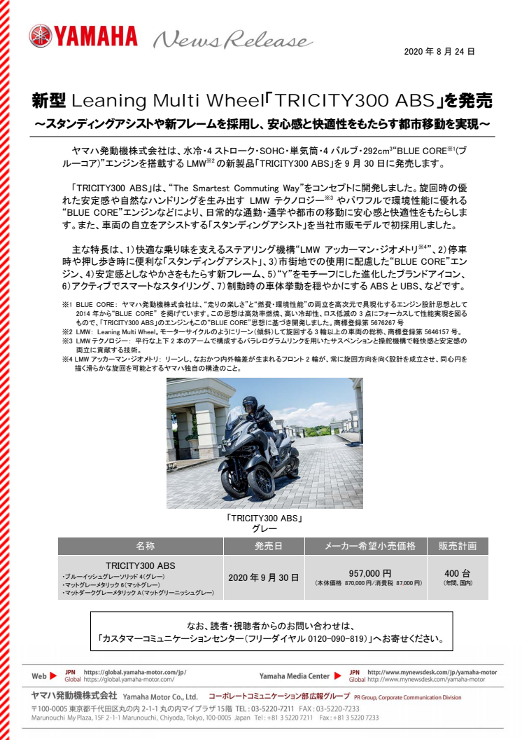 新型Leaning Multi Wheel「TRICITY300 ABS」を発売 〜スタンディングアシストや新フレームを採用し、安心感と快適性をもたらす都市移動を実現〜