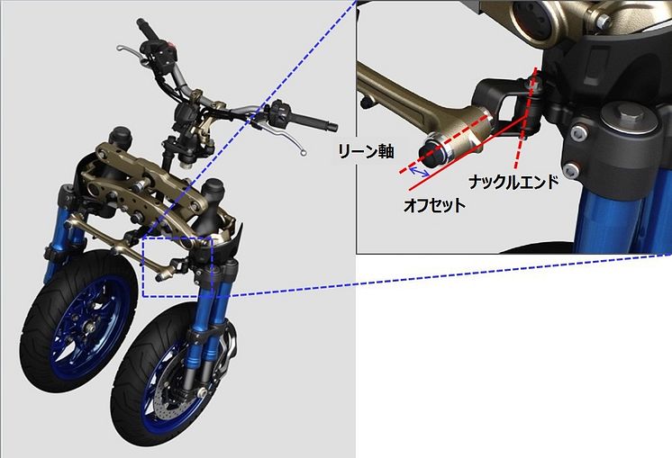 ※4:LMWアッカーマン・ジオメトリ=リーンし、なおかつ内外輪差が生まれるフロント2輪が、常に旋回方向を向く設計を成立させ、同心円を描く滑らかな旋回が可能とするヤマハ独自の構造のこと。