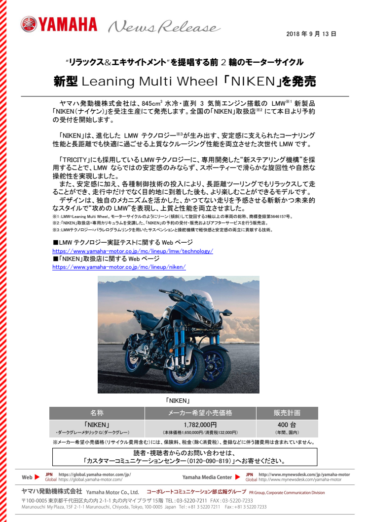 ヤマハ発動機株式会社は、845cm 3水冷・直列3気筒エンジン搭載のLMW※1新製品「NIKEN(ナイケン)」を受注生産にて発売します。全国の「NIKEN」取扱店※2にて本日より予約の受付を開始します。