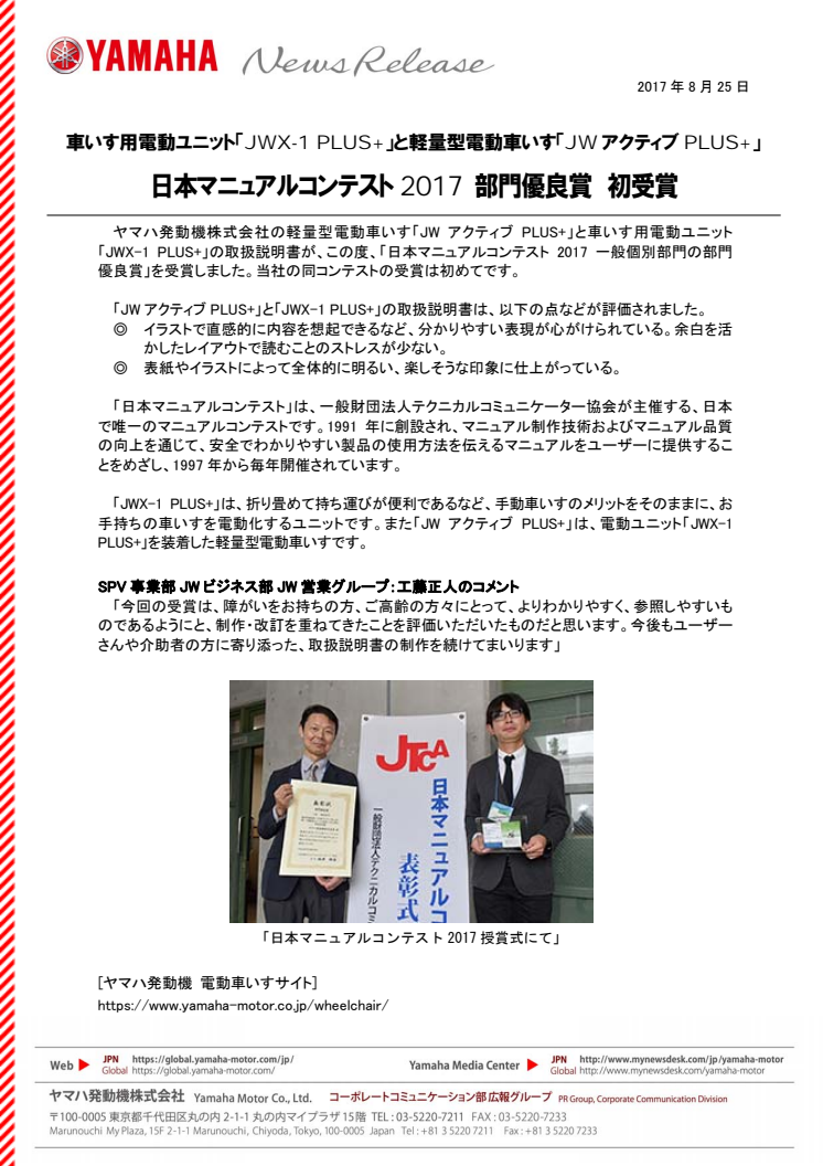 ヤマハ発動機株式会社の軽量型電動車いす「JWアクティブPLUS+」と車いす用電動ユニット「JWX-1 PLUS+」の取扱説明書が、この度、「日本マニュアルコンテスト2017 一般個別部門の部門優良賞」を受賞しました。当社の同コンテストの受賞は初めてです。
